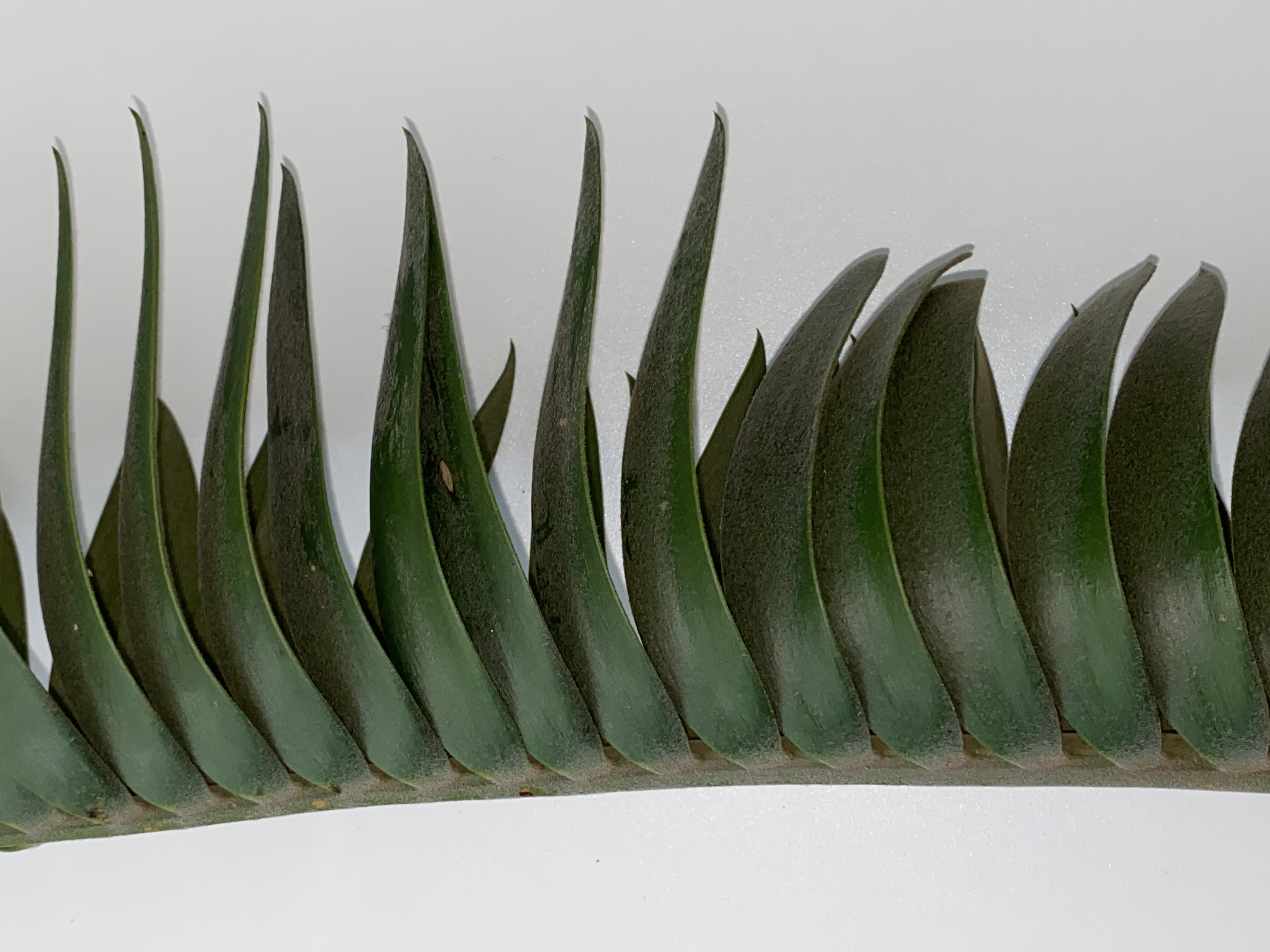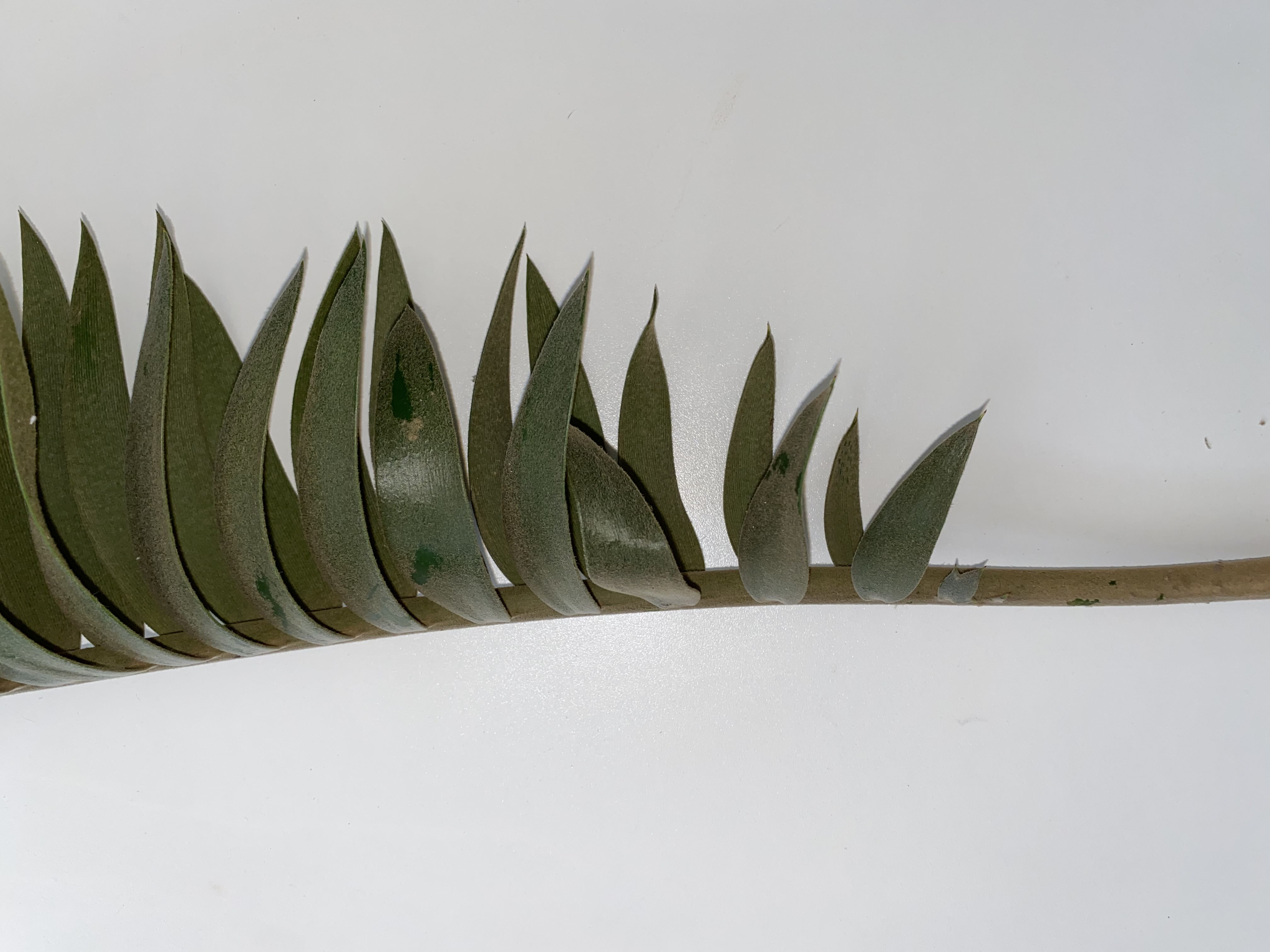 lower side. - Leaves are stiff with a typical upwards and inwards curl, creating a cuped shape